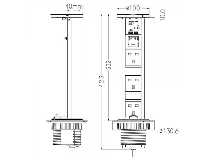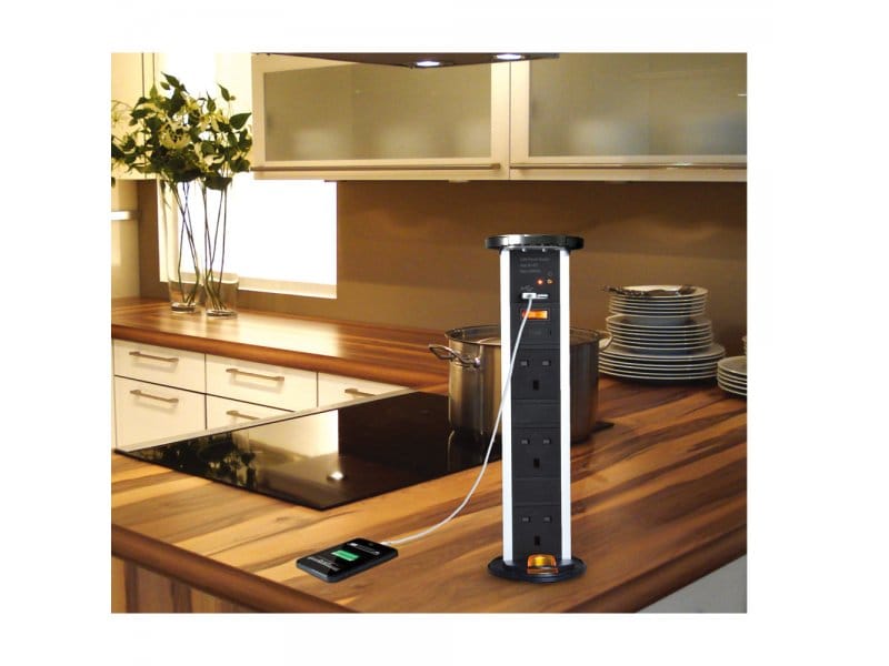 Pop Up socket – 3 x 13A BS socket with 2 x USB-A chargers is made from high-quality aluminium housing and zinc alloy die cast top cover. The IP54 waterproof unique design gives a stylish look. This feature means the socket is capable of closing to its recessed state, while appliances are still plugged in. Ideal for a modern kitchen, under-cabinet, hotel room, or meeting room, the flexible style maintains sleek & refined lines.