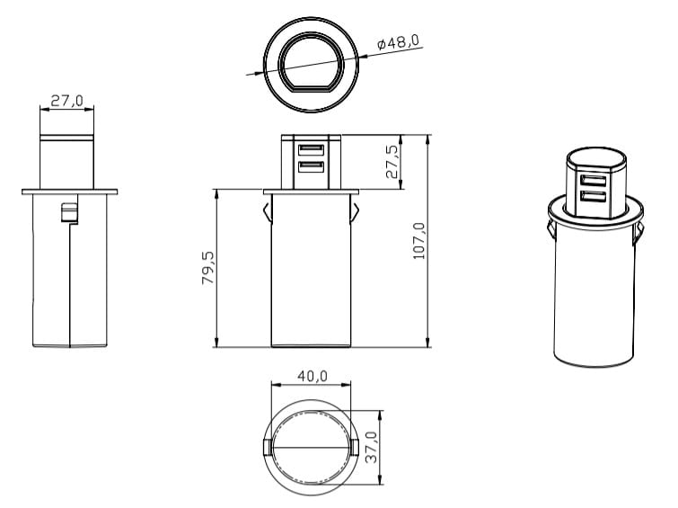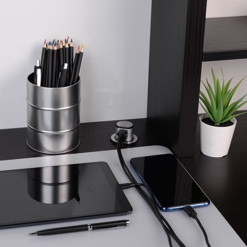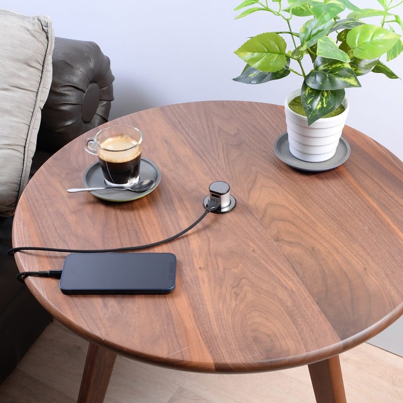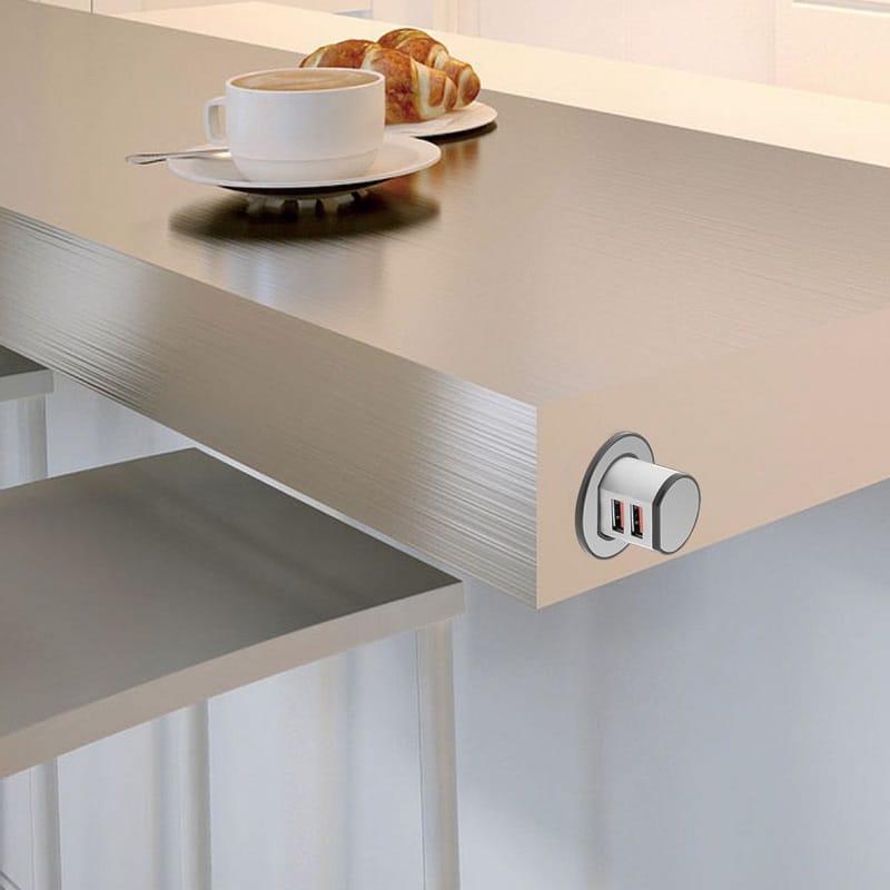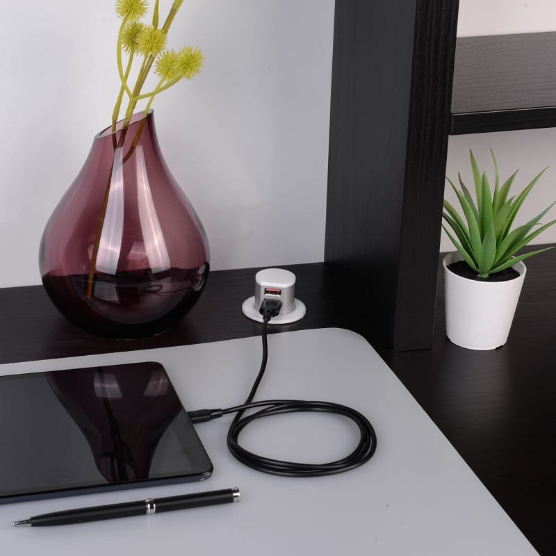 Our Miniature Pop-up Dual USB-A Quick charger is made from high-quality aluminium housing and reinforced engineered plastic. A unique recessed design and stylish appearance make it ideal for any modern home kitchen, hotel room, or office.
