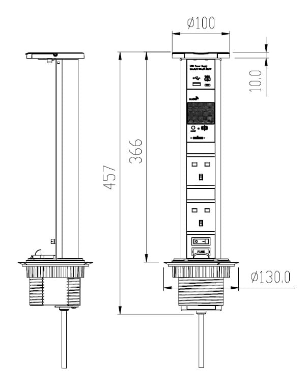 Waterproof – Pop up socket with 2 Socket, Dual USB-A+C quick charger & Bluetooth audio (TWS) Specification