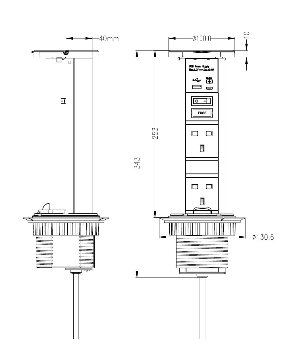 Waterproof – Pop up socket with 2 Socket & Dual USB Quick charger Specification