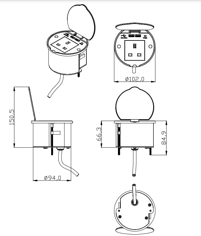 Waterproofed Desktop Power Station (recessed mount) 1 socket with Dual USB-A+C Quick Charger Specification
